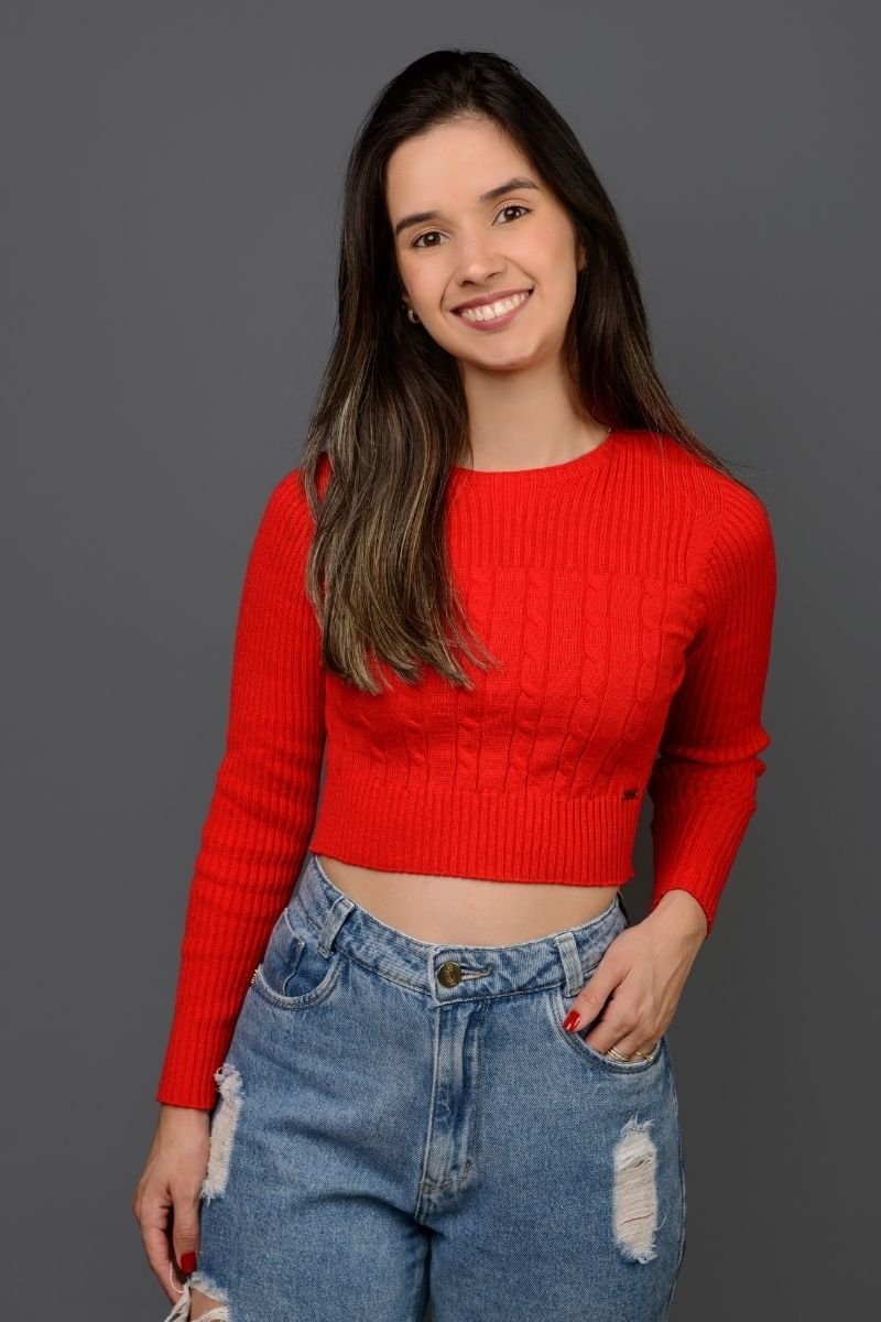 Blusa Cropped Tricot com detalhes canelados e busto com tranças.