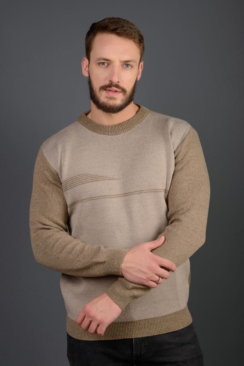 Blusão masculino com detalhe em jacquard listras. Gola redonda. Manga e costas lisas.