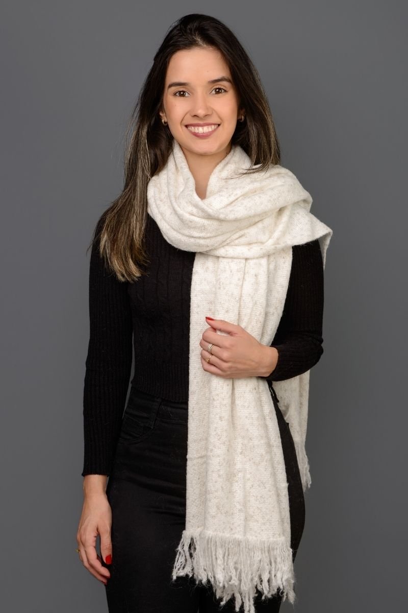 Manta / Cachecol em tricot mais largo proporcionando várias formas de uso. Lindo acabamento com franjas.