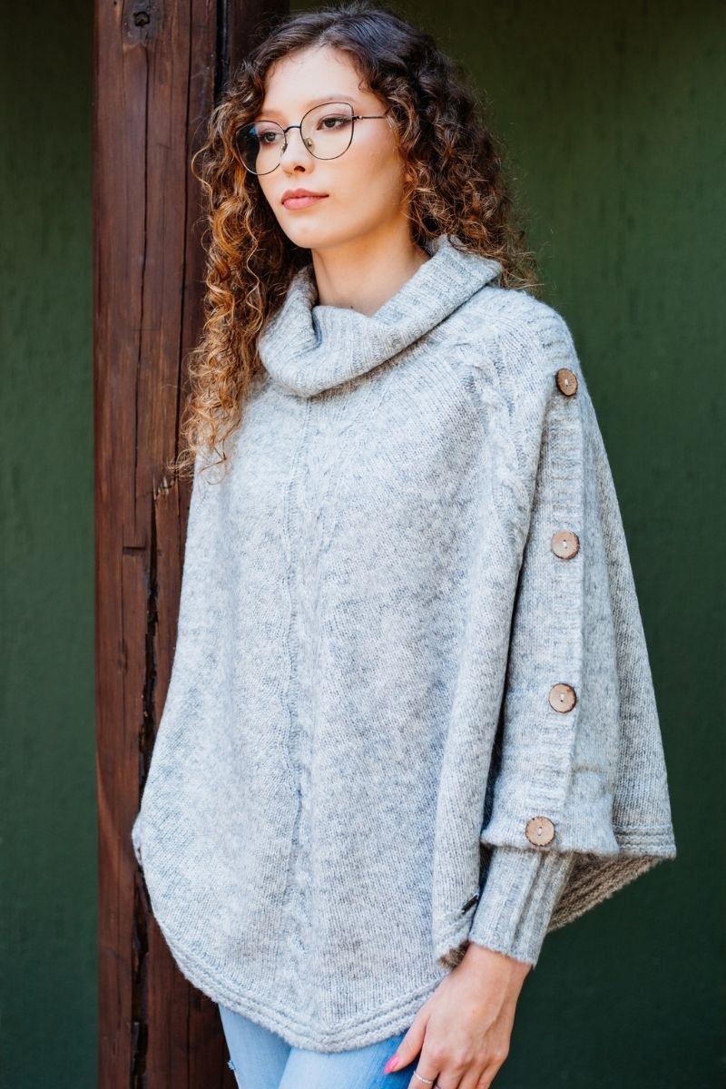 Com um design elegante, este poncho apresenta detalhes em tranças que trazem um charme especial, além de botões que adicionam um toque de sofisticação. A gola boba proporciona um caimento leve e aconchegante, ideal para aqueles dias mais fresquinhos. Versátil e fácil de combinar, este poncho é a escolha perfeita para quem busca conforto sem abrir mão da moda. Experimente e sinta-se envolvida por sua suavidade e estilo!