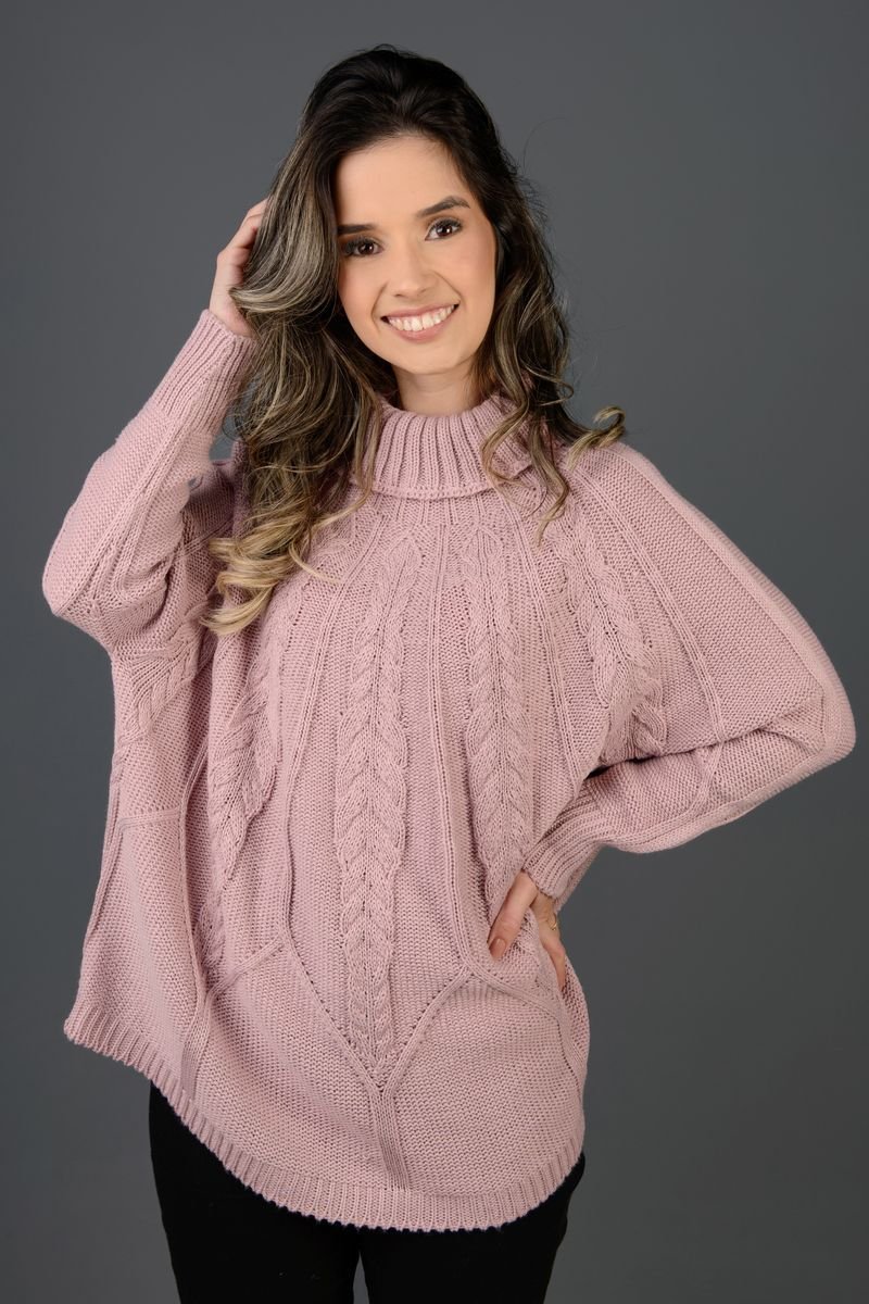 Poncho tricot com gola alta e com manga. Lindos detalhes com tranças e canelados. Esta peça apresenta visual elegante e tem ótimo caimento, trazendo movimento para o seu look.