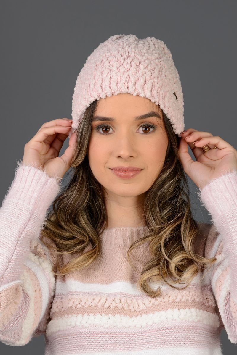 Touca tricot com acabamento em ping pong e forrada com pelinho. Item diferenciado para trazer conforto e charme ao seu look.